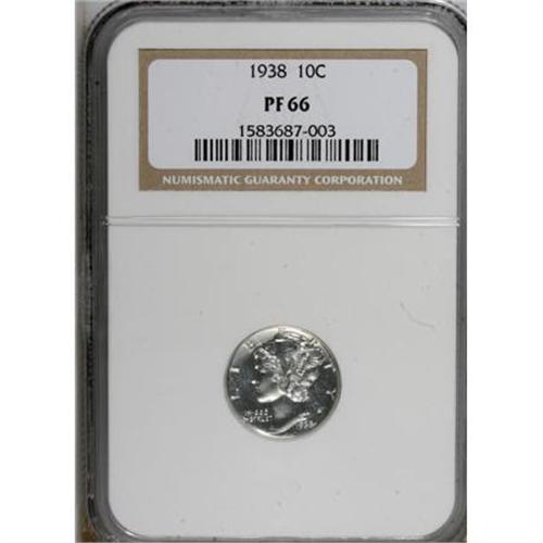 <B>1938 10C PR66 NGC.</B></I> NGC Census: (568/212). PCGS Population (619/160). Mintage: 8,728. Numismedia Wsl. Price for NGC/PCGS coin in PR66: $460. (#5073)<BR><BR><B>Coin Engraver:</B> Adolph A. Weinman<BR><BR><b>Shipping:</b> Coins & Currency (<a target="_blank" href="http://www.heritageauctions.com/common/shipping.php">view shipping information</a>)