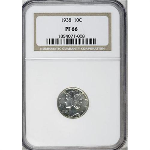 <B>1938 10C PR66 NGC.</B></I> NGC Census: (603/228). PCGS Population (629/162). Mintage: 8,728. Numismedia Wsl. Price for NGC/PCGS coin in PR66: $450. (#5073)<BR><BR><B>Coin Engraver:</B> Adolph A. Weinman<BR><BR><b>Shipping:</b> Coins & Currency (<a target="_blank" href="http://www.heritageauctions.com/common/shipping.php">view shipping information</a>)
