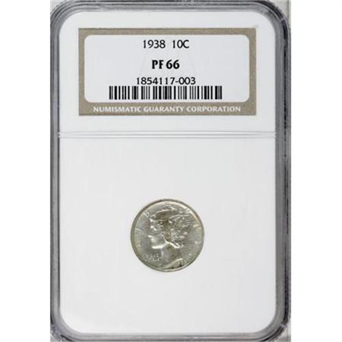 <B>1938 10C PR66 NGC.</B></I> NGC Census: (603/228). PCGS Population (629/162). Mintage: 8,728. Numismedia Wsl. Price for NGC/PCGS coin in PR66: $450. (#5073)<BR><BR><B>Coin Engraver:</B> Adolph A. Weinman<BR><BR><b>Shipping:</b> Coins & Currency (<a target="_blank" href="http://www.heritageauctions.com/common/shipping.php">view shipping information</a>)
