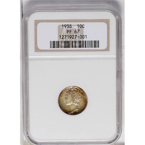 <B>1938<10C> PR67 NGC.</B></I> The obverse's practically flawless and highly reflective surfaces are toned in streaks of gold and magenta, while the reverse exhibits a similar, more subtle pattern. A Superb Gem with stunning eye appeal.