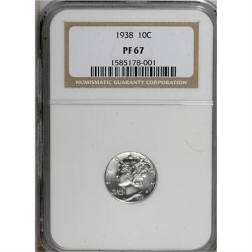 <B>1938 10C PR67 NGC.</B></I> NGC Census: (182/30). PCGS Population (154/6). Mintage: 8,728. Numismedia Wsl. Price for NGC/PCGS coin in PR67: $870. (#5073)<BR><BR><B>Coin Engraver:</B> Adolph A. Weinman<BR><BR><b>Shipping:</b> Coins & Currency (<a target="_blank" href="http://www.heritageauctions.com/common/shipping.php">view shipping information</a>)