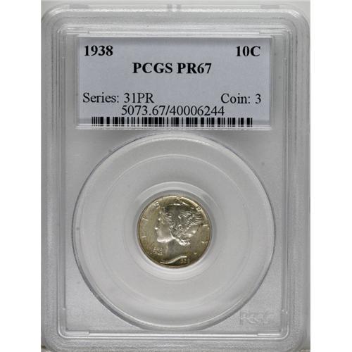 1938 10C PR67 PCGS. Light russet streaks overlie the p