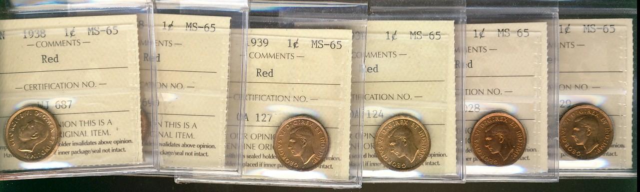 1938, 1939 & 1947 1¢ ICCS MS65RD. Lot of 6 coins, two of each date.