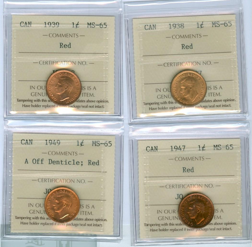 1938, 1939, 1947 & 1949 A off 1¢. Lot of four coins all ICCS MS65RD.