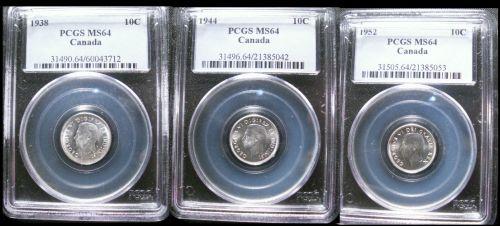 1938, 1944 & 1952 10¢ all PCGS MS64. A