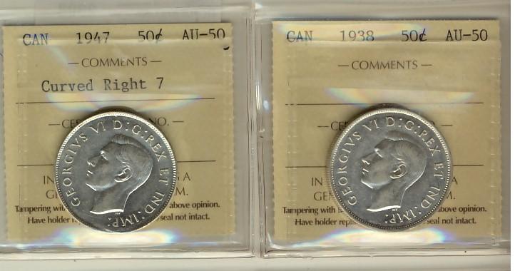 1938 & 1947 C7R 50¢ ICCS AU50. Lot of 2 coins.