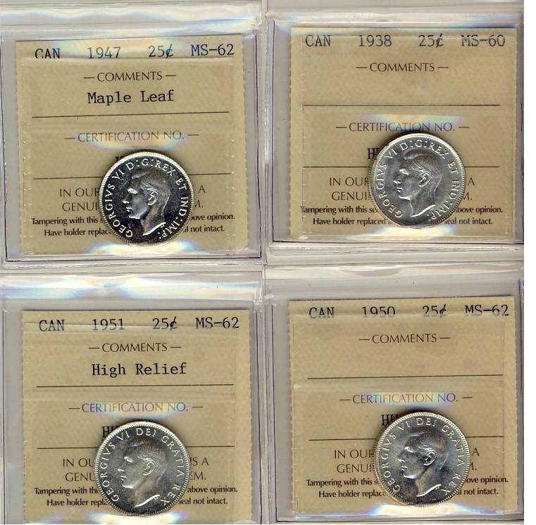 1938, 1947 ML, 1950 & 1951 HR 25¢. Lot of 4 mintstate ICCS coins all but the 1938 grade MS62. 1938 grades MS60.