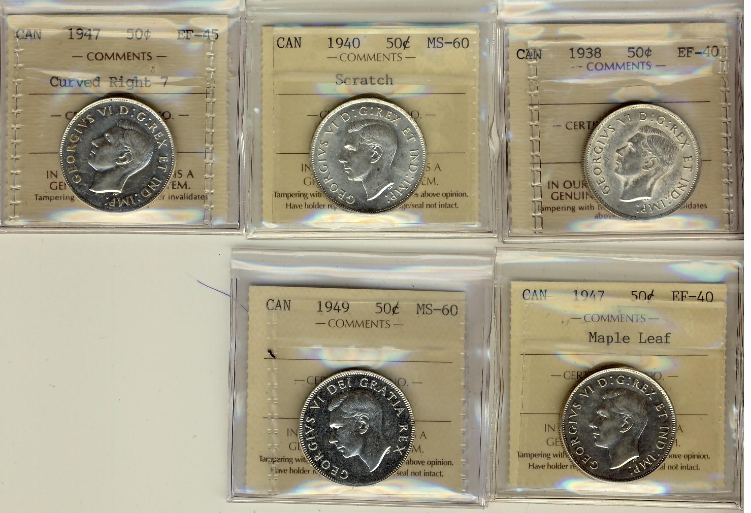 1938 & 1947 ML EF40, 1947 C7R EF45, 1949 MS60 & 1940 MS60 Scratch. Lot of 5 ICCS graded coins.