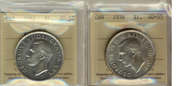 1938 & 1951 Arnp $1 ICCS AU55. Lot of 2 coins.