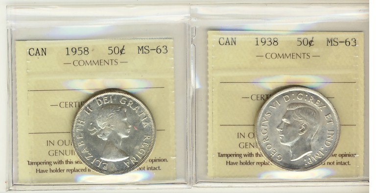 1938 & 1958 ICCS MS63. Lot of 2 coins.