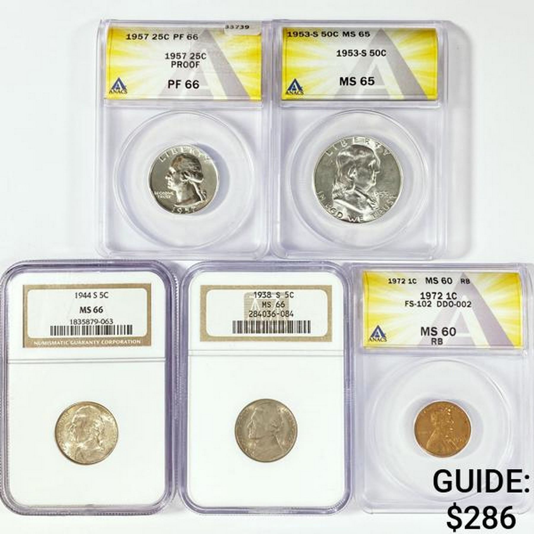 1938-1972 SET (5) 1 1C,2 5C,1 25C,1 50C NGC,ANACS