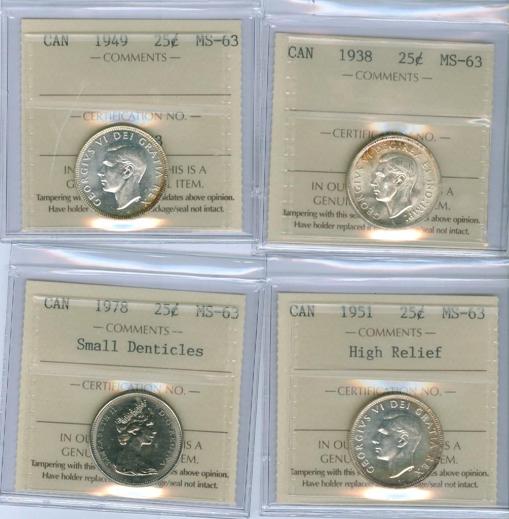 1938-1978 25¢. Lot of four coins all ICCS MS63, including 1938, 1949, 1951 HR and 1978 Sml dent.