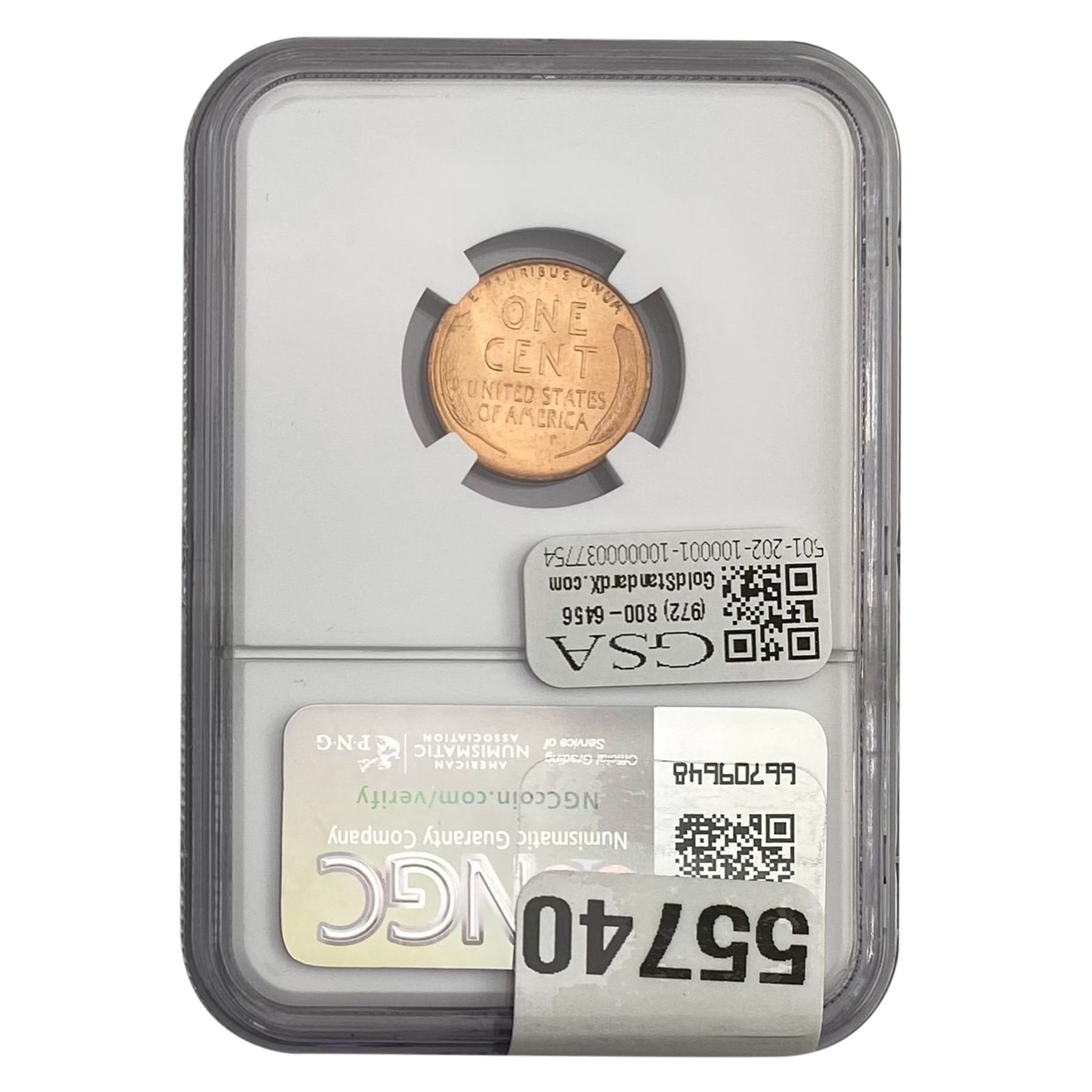 e. Coins sold referencing a third-party grading service are sold “AS IS” without any express or implied warranty, except for a guarantee by GSA that they are genuine. Removal or alteration of the holder, voids all of Bidder’s claims concerning that Product. Certain warranties may be available from the grading services and Bidders are referred to them for further details: Numismatic Guaranty Corporation (NGC), PO Box 4776, Sarasota, FL 34230, www.ngccoin.com/services/writtenguarantee.asp; Professional Coin Grading Services (PCGS), PO Box 9458, Newport Beach, CA 92658, www.pcgs.com/guarantee.html; ANACS, 6555 S. Kenton St., Ste. 303, Englewood, CO 80111; and Independent Coin Grading Co. (ICG), 7901 East Bellview, Ave., Suite 50, Englewood, CO 80111.
