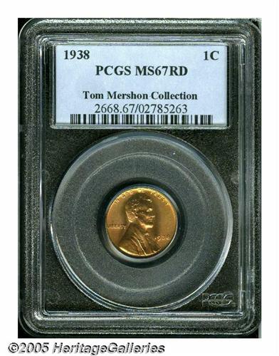 <B>1938<1C> MS67 Red PCGS.</B></I> Almost completely covered in honey-gold patina, this piece is fully lustrous and well struck. A very pleasing Superb Gem example with gobs of eye appeal. None graded higher by NGC or PCGS.<BR><I>From The Tom Mershon #2 All-Time PCGS Registry Set of Lincoln Wheat Cents.</B></I>