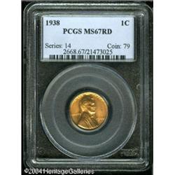 1938 1C MS67 Red PCGS. Fully struck and nearly imp <B>1938 1C MS67 Red PCGS.</B></I> Fully struck and nearly impeccably preserved, with a couple of faint grazes and tiny nicks on the otherwise sparklingly lustrous, beautifully toned surfaces of this no-questions Superb Gem. <BR><BR><B>Important notice:</B> Heritage usually auctions material at the rate of 200-250 lots per hour. On some occasions eBay Live bid software or the Internet may not be able to keep up with the pace of the auction. We recommend placing a realistic absentee bid now as insurance to avoid disappointment. Occasionally the auctioneer may eliminate or reject an eBay Live bid, and the auctioneer may also reopen a lot after the close of the eBay live bidding (usually because we missed an audience bid), and may reject your bid even if it shows you as the winning bidder. By bidding via eBay Live, you agree that Heritage may award the lot to another bidder at its sole discretion under the circumstances described above or any other reasonable circumstances. Since eBay bids are not shown to us until we open the lot on the floor, we treat those bids just like floor bids. In most cases the floor responds before the eBay bid is presented to us, due to Internet lag time, so for consistency we have made it a policy that floor bids are always considered first over tie eBay live bids. Also please note that all Heritage lots purchased through eBay Live carry a 20% Buyer's Premium. Please make sure you read the Terms and Conditions before you bid. This lot is being auctioned in conjunction with a live floor auction by Heritage Galleries & Auctioneers. All final auction and invoice information will be supplied by Heritage Galleries & Auctioneers, and all other information should be considered preliminary. Lot:5343
