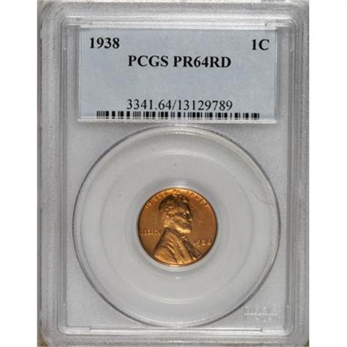 <B>1938 1C PR64 Red PCGS.</B></I> PCGS Population (505/733). NGC Census: (188/328). Mintage: 14,734. Numismedia Wsl. Price for NGC/PCGS coin in PR64: $108. (#3341)<BR><BR><b>Shipping:</b> Coins & Currency (<a target="_blank" href="http://www.heritageauctions.com/common/shipping.php">view shipping information</a>)