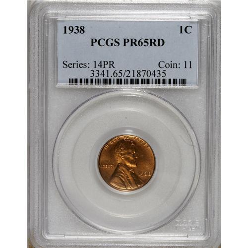 <B>1938 1C PR65 Red PCGS.</B></I> PCGS Population (483/249). NGC Census: (402/254). Mintage: 14,734. Numismedia Wsl. Price for NGC/PCGS coin in PR65: $180. (#3341)<BR><BR><b>Shipping:</b> Coins & Currency (<a target="_blank" href="http://www.heritageauctions.com/common/shipping.php">view shipping information</a>)