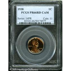 <B>1938 1C PR66 Cameo PCGS.</B></I> Stunning orange on black cameo. Aside from one small toning spot on the lower reverse, the surfaces are spotless. This piece generates great overall eye appeal. Population: 4 in 66, 1 finer (1/05). Lot:5621