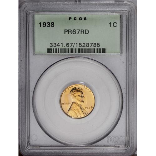 <B>1938<1C> PR67 Red PCGS.</B></I> This needle-sharp Superb Gem is housed in a green label holder and exhibits radiant pumpkin-gold color. Only minute peripheral reverse carbon limits the grade. Population: 25 in 67 Red, 0 finer (1/06).