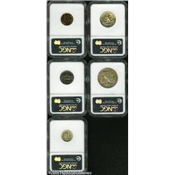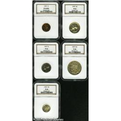 <B>1938 1C Proof Set NGC.</B></I> This five piece set includes: Lincoln Cent PR64 Red, full orange color; Jefferson Nickel PR66, whispers of faint champagne color; Mercury Dime PR66, streaks of light olive patina; Washington Quarter PR65, freckled milky toning; and Walker Half Dollar PR66, light olive-gray patina. 5 Coins Lot:11045