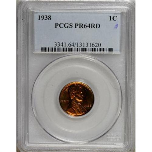 <B>1938 1C PR64 Red PCGS.</B></I> PCGS Population (499/721). NGC Census: (193/332). Mintage: 14,734. Numismedia Wsl. Price for NGC/PCGS coin in PR64: $108. (#3341)<BR><BR><B>Coin Engraver:</B> Victor D. Brenner<BR><BR><b>Shipping:</b> Coins & Currency (<a target="_blank" href="http://www.heritageauctions.com/common/shipping.php">view shipping information</a>)