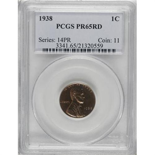 <B>1938 1C PR65 Red PCGS.</B></I> PCGS Population (492/247). NGC Census: (207/128). Mintage: 14,734. Numismedia Wsl. Price for NGC/PCGS coin in PR65: $180. (#3341)<BR><BR><B>Coin Engraver:</B> Victor D. Brenner<BR><BR><b>Shipping:</b> Coins & Currency (<a target="_blank" href="http://www.heritageauctions.com/common/shipping.php">view shipping information</a>)