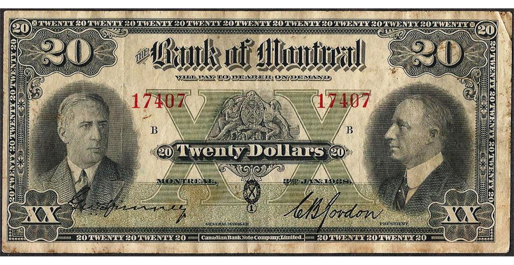 One 1938 $20 The Bank of Montreal Canada Note.