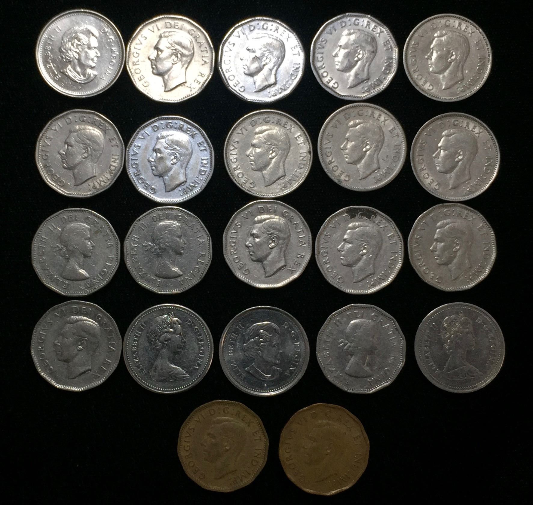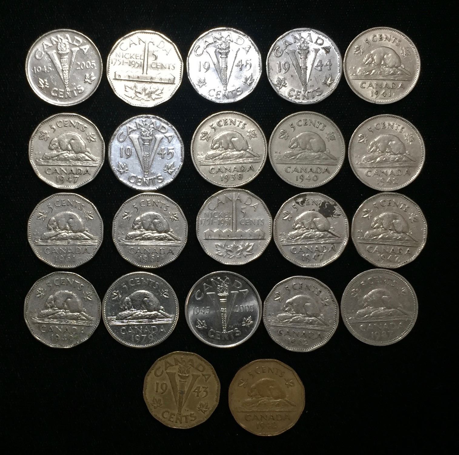 Lot 15; Royal Canadian Mint, Dates Vary 1938-2005 Canada 5-Cents Nickels, Tombac Mixed Lot (Total 22 pieces), Dates Include 1938, 1940, 1941, 1942, 1942 Tombac, 1943 Tombac, 1944 Chromium, 1945 Chromium, 1945 Chromium, 1947, 1949, 1947 Maple Leaf, 1951 King George VI Effigy, 1961, 1962, 1979, 1987, 2005 Victory 'V' Queen Elizabeth II Effigy