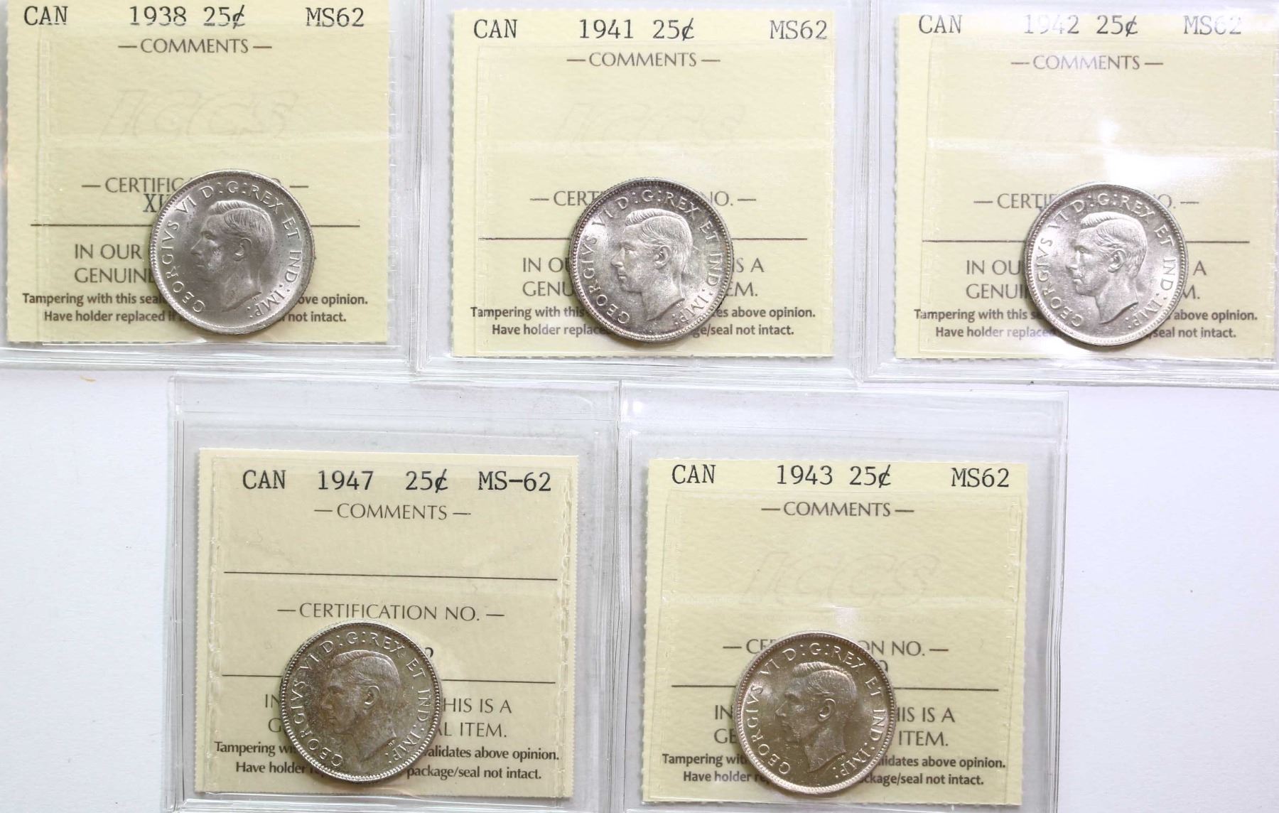 1938 25¢, 1941, 1942, 1943, 1947, All 5 coins ICCS Choice Mint State-62.