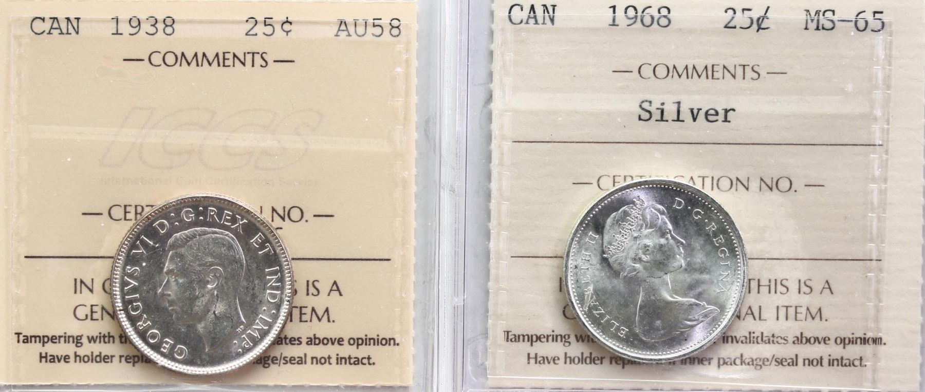 1938 25¢ Choice About Uncirculated-58 & 1968 Gem Mint State-65. Lot of 2 ICCS graded coins.