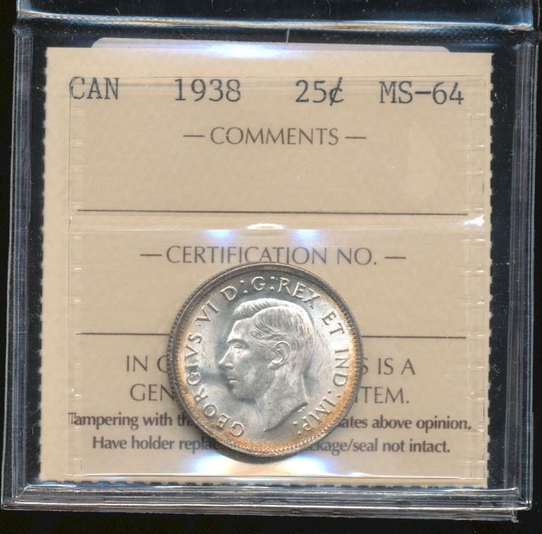 1938 25¢ ICCS MS64. PQ eye appeal with just a hint of gold rim tones.