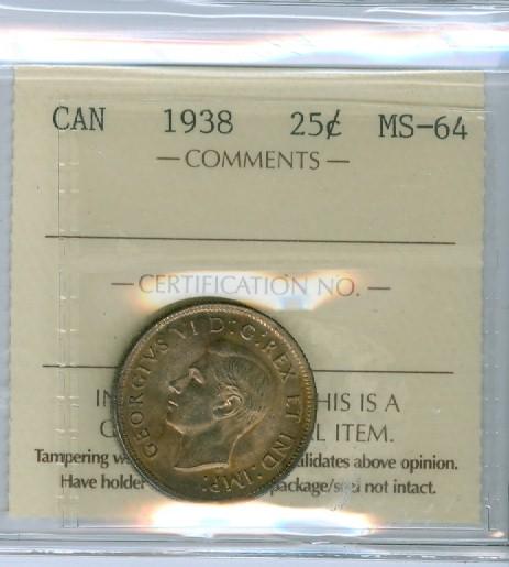 1938 25¢ ICCS MS64, attractive russet and green tones.