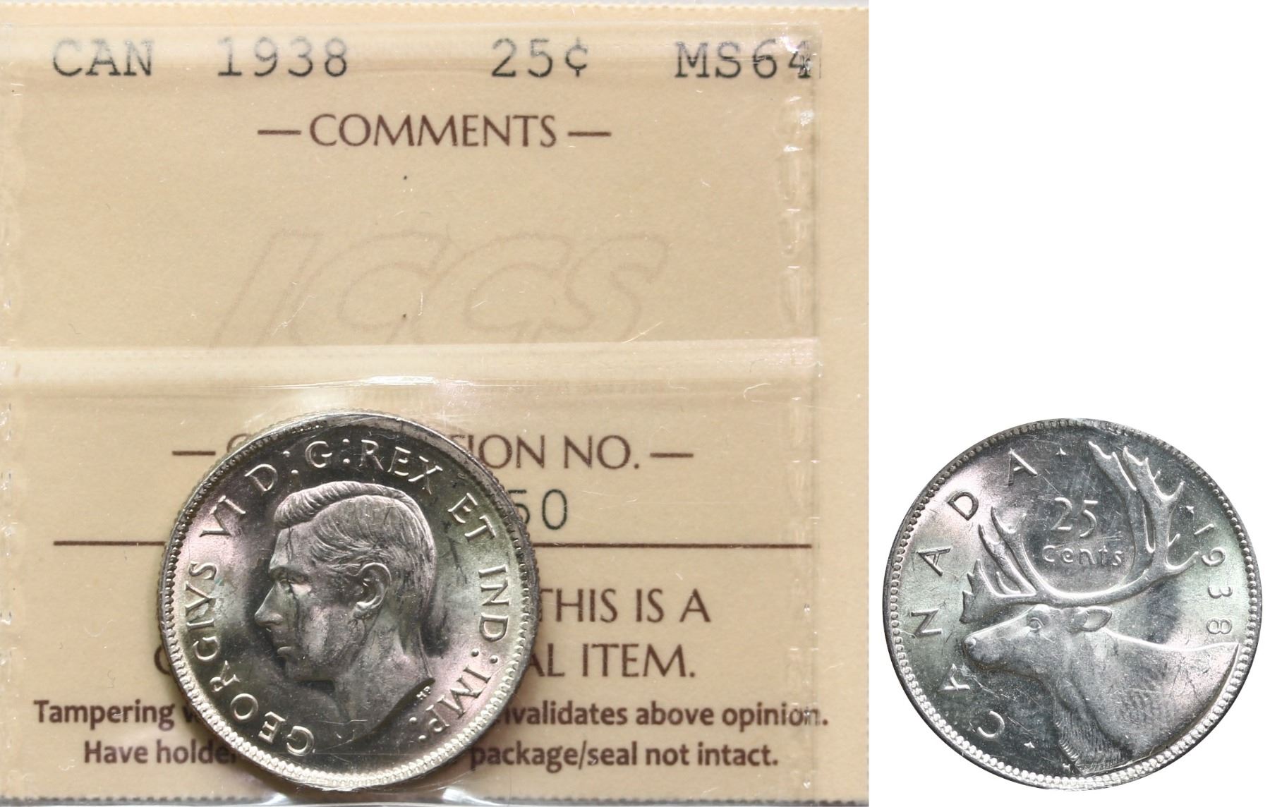 1938 25¢ ICCS Very Choice Mint State-64 Fully brilliant and lustrous.