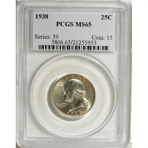 <B>1938 25C MS65 PCGS.</B></I> PCGS Population (389/224). NGC Census: (243/261). Mintage: 9,480,045. Numismedia Wsl. Price for NGC/PCGS coin in MS65: $196. (#5806)<BR><BR><B>Coin Engraver:</B> John Flanagan<BR><BR><b>Shipping:</b> Coins & Currency (<a target="_blank" href="http://www.heritageauctions.com/common/shipping.php">view shipping information</a>)