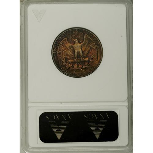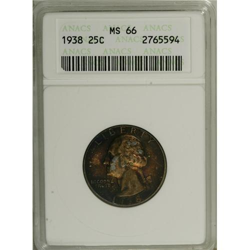 <B>1938 25C MS66 ANACS.</B></I> This densely toned Premium Gem shows a variegated melange of crimson, purple-violet, lime-green, and ice-blue patina over well preserved surfaces. Well struck with vibrant luster beneath the rich toning.<BR><BR><b>Shipping:</b> Coin/Currency (<a target="_blank" href="http://www.heritageauctions.com/common/shipping.php">view shipping information</a>)