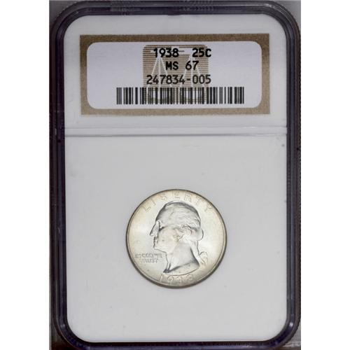 <B>1938<25C> MS67 NGC.</B></I> Whispers of light gold and ice-blue patina adhere to radiantly lustrous surfaces, and the design elements are nicely struck. Some small abrasions are noted on Washington's cheek and eyebrow. Census: 53 in 67, 1 finer (1/06).<BR><I>From The Houston Collection of Washington Quarters.</B></I>