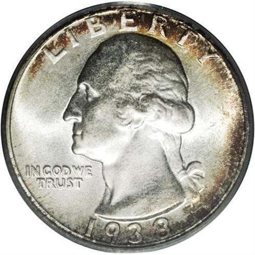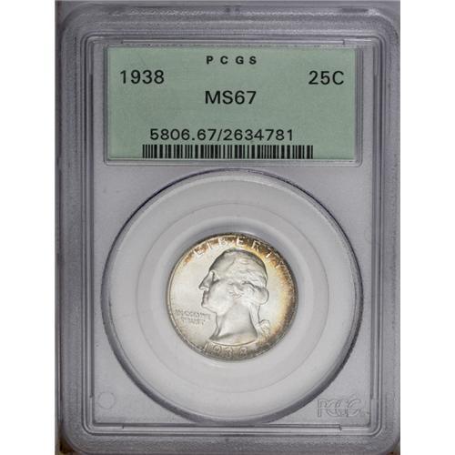 <B>1938<25C> MS67 PCGS.</B></I> With a mintage of a little over nine million pieces, the 1938 is one of the lowest Philadelphia issues. Better-grade Mint State pieces are quite challenging, particularly in MS66 and better. The MS67 coin offered in this lot displays radiant luster, and whispers of olive-green, crimson, and gold around portions of the obverse periphery. The reverse exhibits a thin veil of barely discernible ice-blue and beige patination uniformly distributed. The design elements are well impressed, and both sides are well preserved. A few luster grazes on Washington's neck and in the right (facing) obverse field, and some contact marks scattered about on the eagle, prevent an even higher grade. Population: 22 in 67, 0 finer (1/06).<BR><I>From The Houston Collection of Washington Quarters.</B></I>