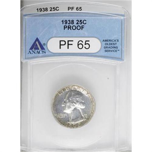 <B>1938 25C PR65 ANACS.</B></I> NGC Census: (286/416). PCGS Population (614/437). Mintage: 8,045. Numismedia Wsl. Price for NGC/PCGS coin in PR65: $290. (#5977)<BR><BR><B>Coin Engraver:</B> John Flanagan<BR><BR><b>Shipping:</b> Coins & Currency (<a target="_blank" href="http://www.heritageauctions.com/common/shipping.php">view shipping information</a>\)