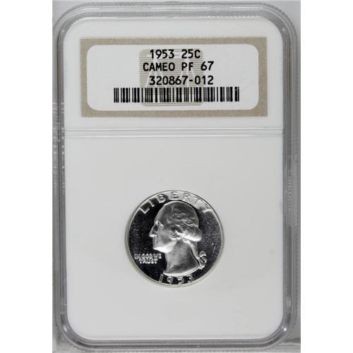 <B>1938<25C> PR65 NGC,</B></I> essentially brilliant with mild contrast on the obverse; and a <B>1953 PR67 Cameo NGC,</B></I> untoned with dazzling cameo effect.