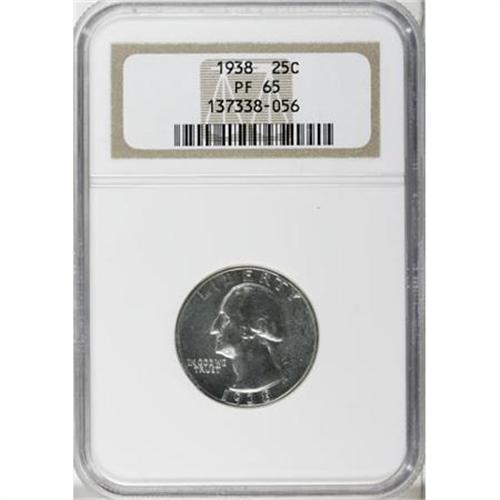 <B>1938 25C PR65 NGC.</B></I> NGC Census: (298/440). PCGS Population (622/452). Mintage: 8,045. Numismedia Wsl. Price for NGC/PCGS coin in PR65: $280. (#5977)<BR><BR><B>Coin Engraver:</B> John Flanagan<BR><BR><b>Shipping:</b> Coins & Currency (<a target="_blank" href="http://www.heritageauctions.com/common/shipping.php">view shipping information</a>)