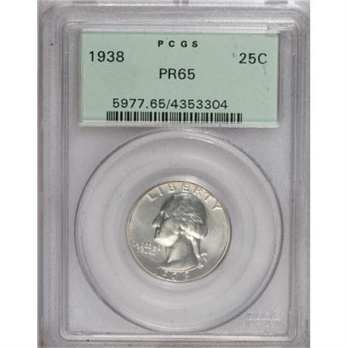 <B>1938 25C PR65 PCGS.</B></I> PCGS Population (616/446). NGC Census: (297/437). Mintage: 8,045. Numismedia Wsl. Price for NGC/PCGS coin in PR65: $290. (#5977)<BR><BR><B>Coin Engraver:</B> John Flanagan<BR><BR><b>Shipping:</b> Coins & Currency (<a target="_blank" href="http://www.heritageauctions.com/common/shipping.php">view shipping information</a>)