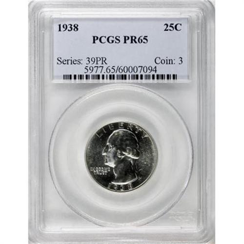 <B>1938 25C PR65 PCGS.</B></I> PCGS Population (622/451). NGC Census: (298/438). Mintage: 8,045. Numismedia Wsl. Price for NGC/PCGS coin in PR65: $280. (#5977)<BR><BR><B>Coin Engraver:</B> John Flanagan<BR><BR><b>Shipping:</b> Coins & Currency (<a target="_blank" href="http://www.heritageauctions.com/common/shipping.php">view shipping information</a>)