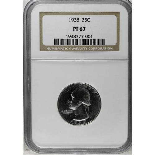<B>1938<25C> PR67 NGC.</B></I> A shimmering Superb Gem with nice detail, though the mirrors are slightly shallow. Largely untoned with parts of Washington's ribbon missing (as struck, likely due to a lapped die).
