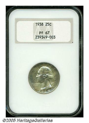 <B>1938<25C> PR67 NGC.</B></I> Cloudy olive-tan patina runs over each side. The design elements are exquisitely struck, and the pristine surfaces are seemingly devoid of mentionable marks. Population: 70 in 67, 7 finer (6/05).