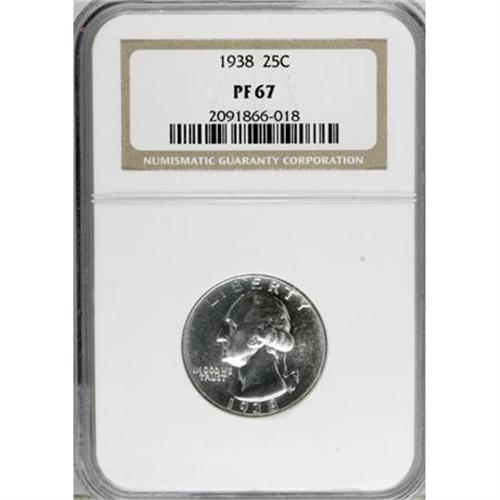 <B>1938 25C PR67 NGC.</B></I> NGC Census: (87/11). PCGS Population (69/2). Mintage: 8,045. Numismedia Wsl. Price for NGC/PCGS coin in PR67: $775. (#5977)<BR><BR><b>Shipping:</b> Coins & Currency (<a target="_blank" href="http://www.heritageauctions.com/common/shipping.php">view shipping information</a>)