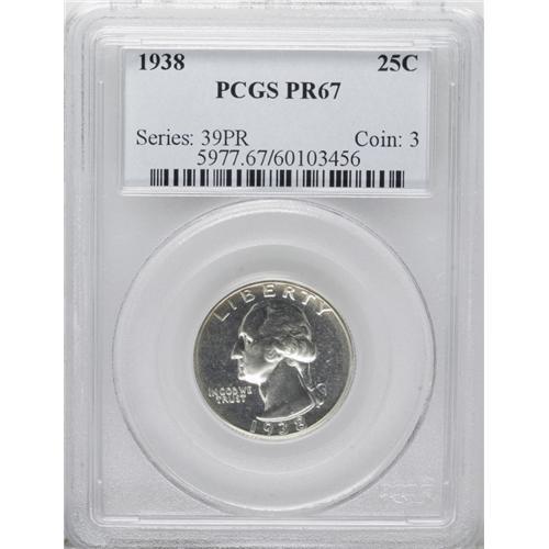 <B>1938 25C PR67 PCGS.</B></I> An overlooked early modern proof with a low mintage of only 8,045 pieces. This is a sparkling, deeply reflective proof. The surfaces are mostly brilliant with just the faintest touch of golden patina at the top of the obverse.<BR><BR><b>Shipping:</b> Coins & Currency (<a target="_blank" href="http://www.heritageauctions.com/common/shipping.php">view shipping information</a>)