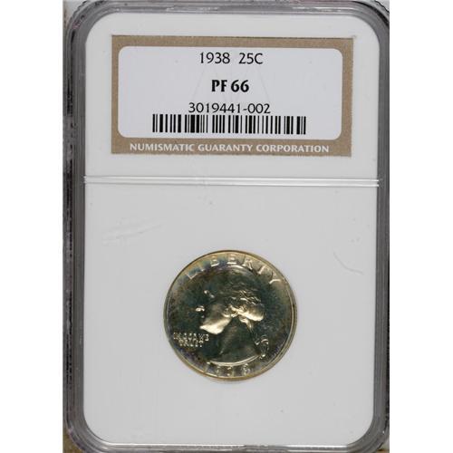 <B>1938 25C PR66 NGC.</B></I> An essentially perfect example of this scarce, popular early proof. Each side is mostly brilliant with light bit of multicolored patina encircling the margins.<BR><BR><b>Shipping:</b> Coins & Currency (<a target="_blank" href="http://www.heritageauctions.com/common/shipping.php">view shipping information</a>) <BR><BR><