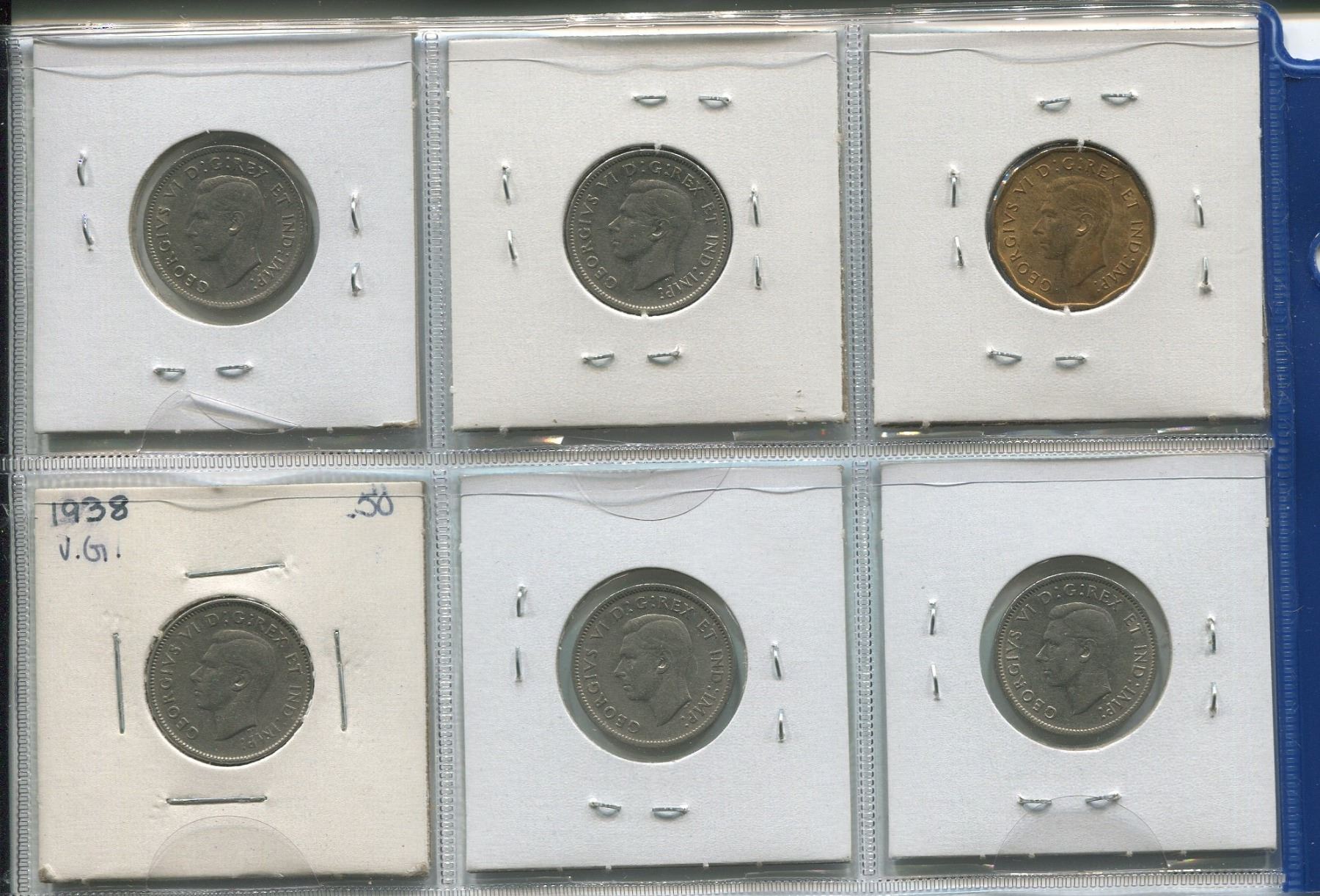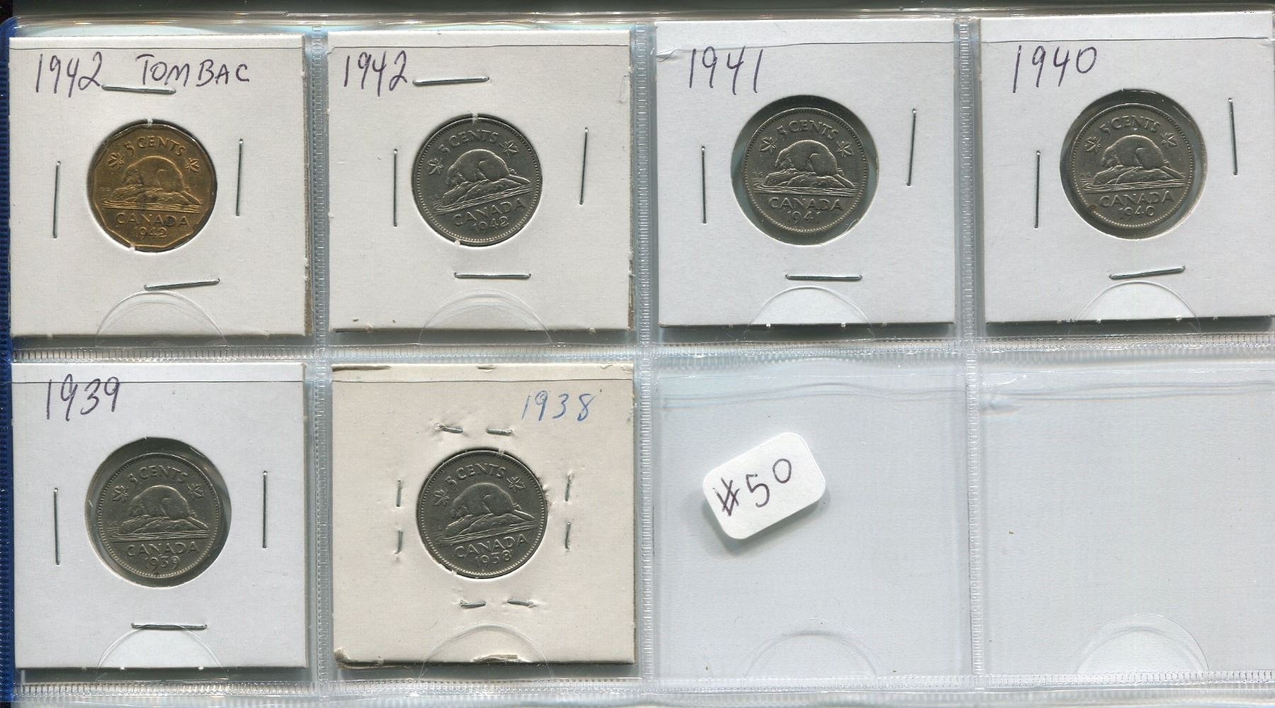 1938,39.40,41,42&42Tombac,6-Canadian 5 cent coins,King George VI