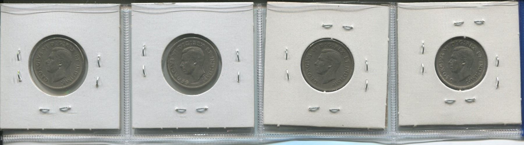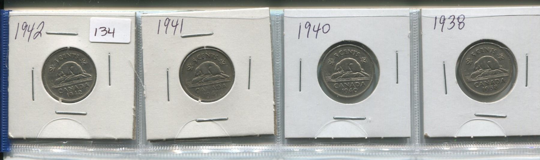 1938,40,41 & 42,4-Canadian 5 cent coins,King George VI