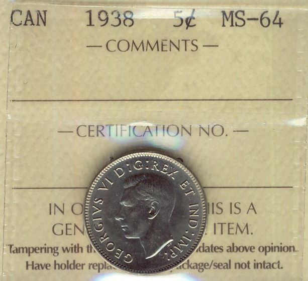 1938 5¢ ICCS MS64.